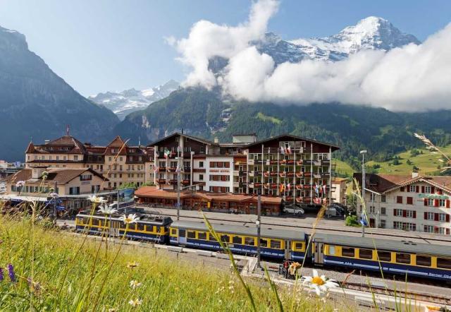 登山列車のグリンデルワルド駅から徒歩5分強のところにあるデラックスホテル。赤い窓を配した茶色の建物で、登山列車からも目に入る。客室のインテリアは木をふんだんに使ったスイスの伝統的な造り。前庭は手入れが行き届いている。バルコニーからの眺めは息をのむほど。クローテン国際空港から約170km。